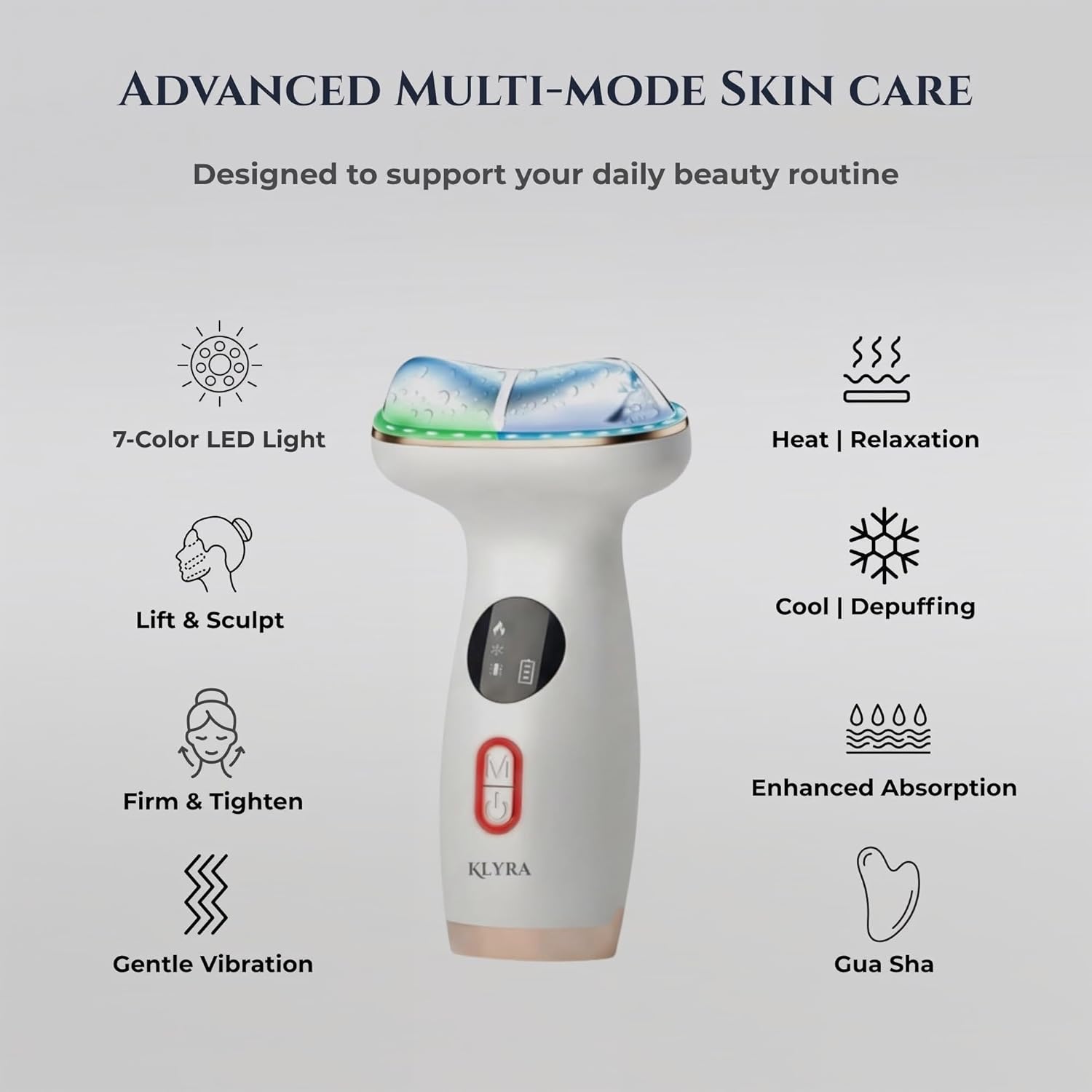 【7-IN-1 Hot & Cold Beauty Device】Experience complete facial rejuvenation with hot/cold therapy, microcurrent EMS, vibration, LED light treatment, and a sculpted gua sha head designed for lifting, tightening, depuffing, and enhancing your daily skincare routine.