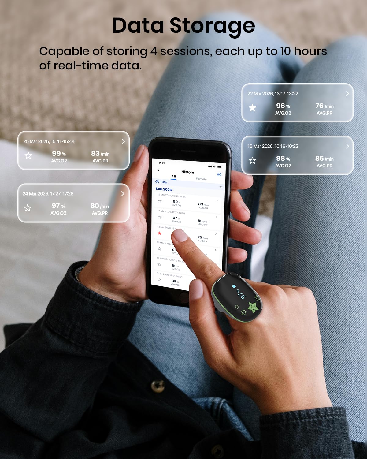 【Built-in Memory】Automatically records and stores 4 sessions of 10-hour data. Data is viewable on the device and can be synced to the app via Bluetooth.